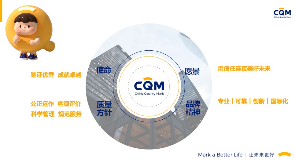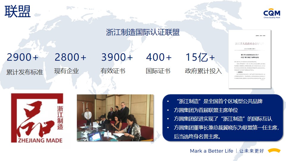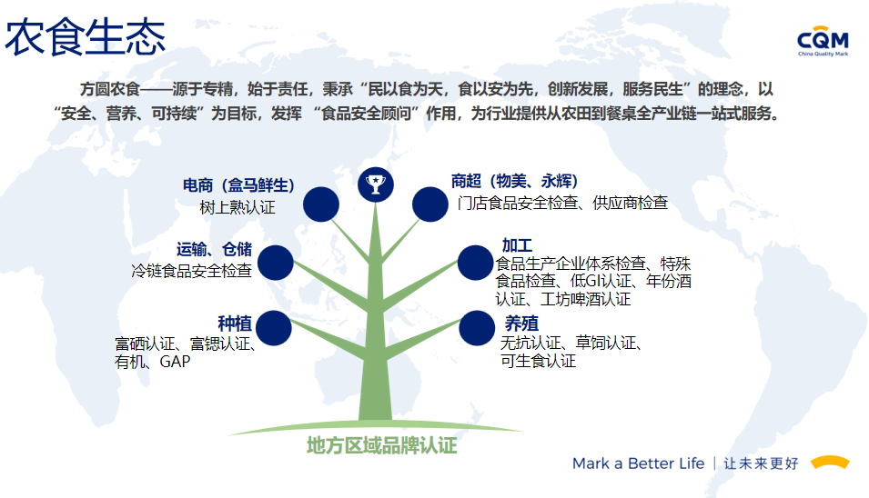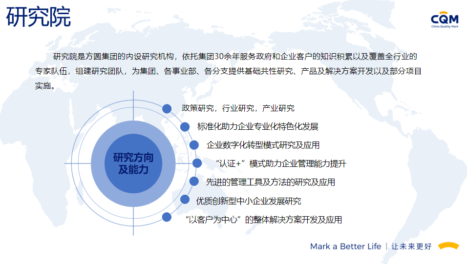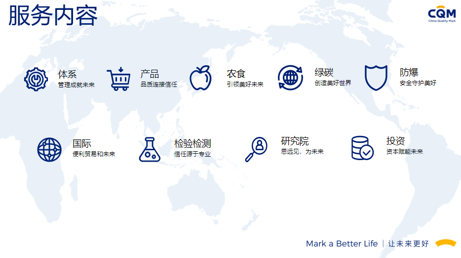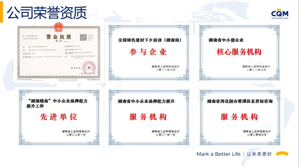 方圆标志认证集团(简称方圆,英文缩写CQM)起步于1991年,由“中国方圆标志认证委员会”发展演变而来,在引入和奠基中国认证制度的同时,与我国认证认可事业共同成长,业已发展成为集认证、培训、技术服务、检验检测、政策研究、标准制定、国际合作于一体,面向全球的集团化、综合性服务机构,已形成以核心企业方圆标志认证集团有限公司及30余家分子公司共同组建的、覆盖全国的服务网络。方圆标志认证集团湖南有限公司成立于2003年,原隶属湖南省质量技术监督局,经国家认监委正式批准备案,是湖南省最大、最有影响的名牌认证机构之一。2017年改制成为方圆标志认证集团具独立法人资格的全资子公司,公司设有业务发展部、审核管理部、绿碳部、农食与产品部、综合部,现有专兼职技术及管理团队200余人。能同时提供认证、管理咨询、绿色低碳、农食、培训等多种服务。我们的服务覆盖了电子、机械、化工、轻工、食品、建材、建筑工程、运输、批发零售业、社团组织、信息、教育、公共行政管理等20多个行业,现拥有省内外千余家优秀客户群体。
