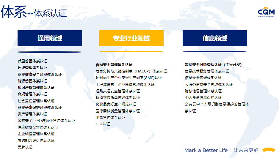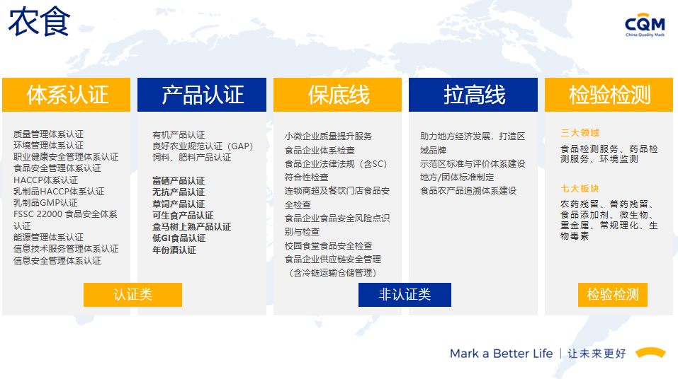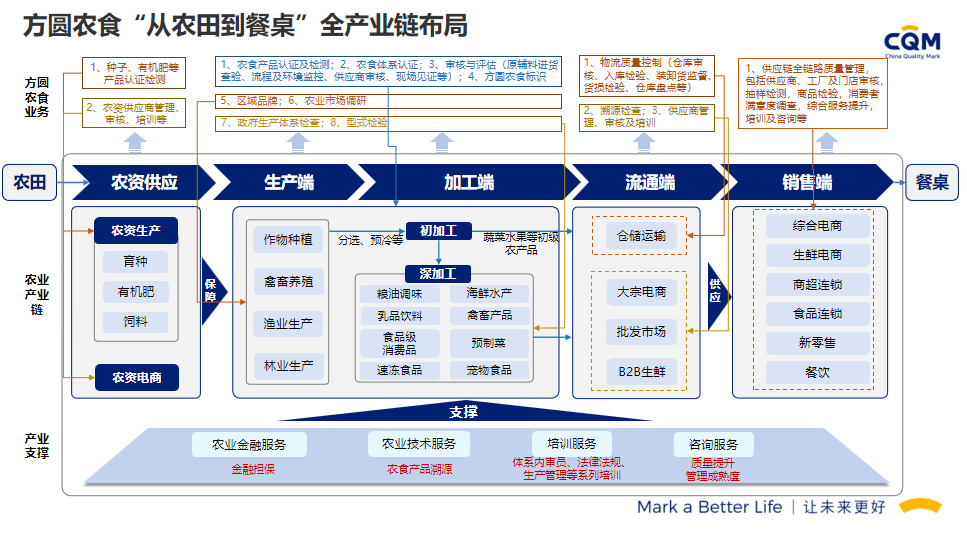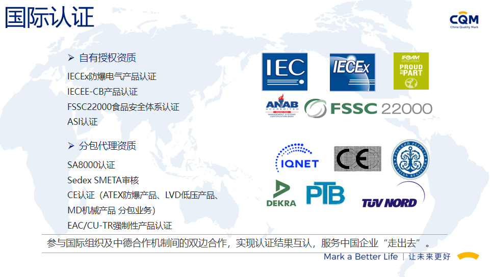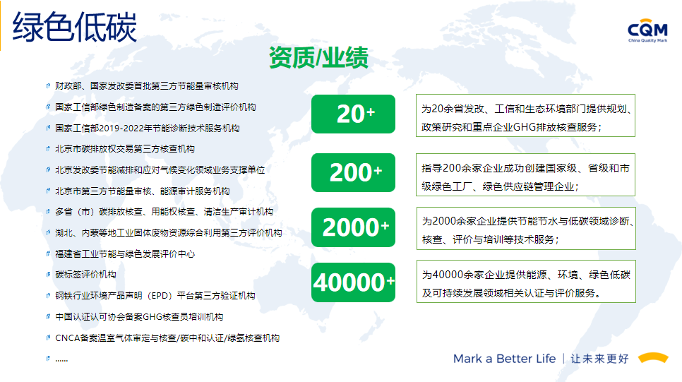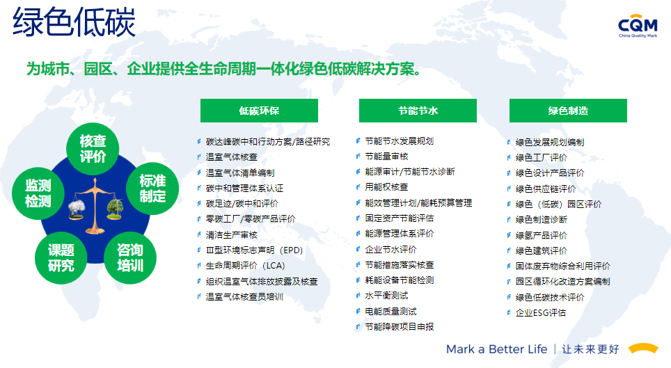 方圆标志认证集团(简称方圆,英文缩写CQM)起步于1991年,由“中国方圆标志认证委员会”发展演变而来,在引入和奠基中国认证制度的同时,与我国认证认可事业共同成长,业已发展成为集认证、培训、技术服务、检验检测、政策研究、标准制定、国际合作于一体,面向全球的集团化、综合性服务机构,已形成以核心企业方圆标志认证集团有限公司及30余家分子公司共同组建的、覆盖全国的服务网络。方圆标志认证集团湖南有限公司成立于2003年,原隶属湖南省质量技术监督局,经国家认监委正式批准备案,是湖南省最大、最有影响的名牌认证机构之一。2017年改制成为方圆标志认证集团具独立法人资格的全资子公司,公司设有业务发展部、审核管理部、绿碳部、农食与产品部、综合部,现有专兼职技术及管理团队200余人。能同时提供认证、管理咨询、绿色低碳、农食、培训等多种服务。我们的服务覆盖了电子、机械、化工、轻工、食品、建材、建筑工程、运输、批发零售业、社团组织、信息、教育、公共行政管理等20多个行业,现拥有省内外千余家优秀客户群体。